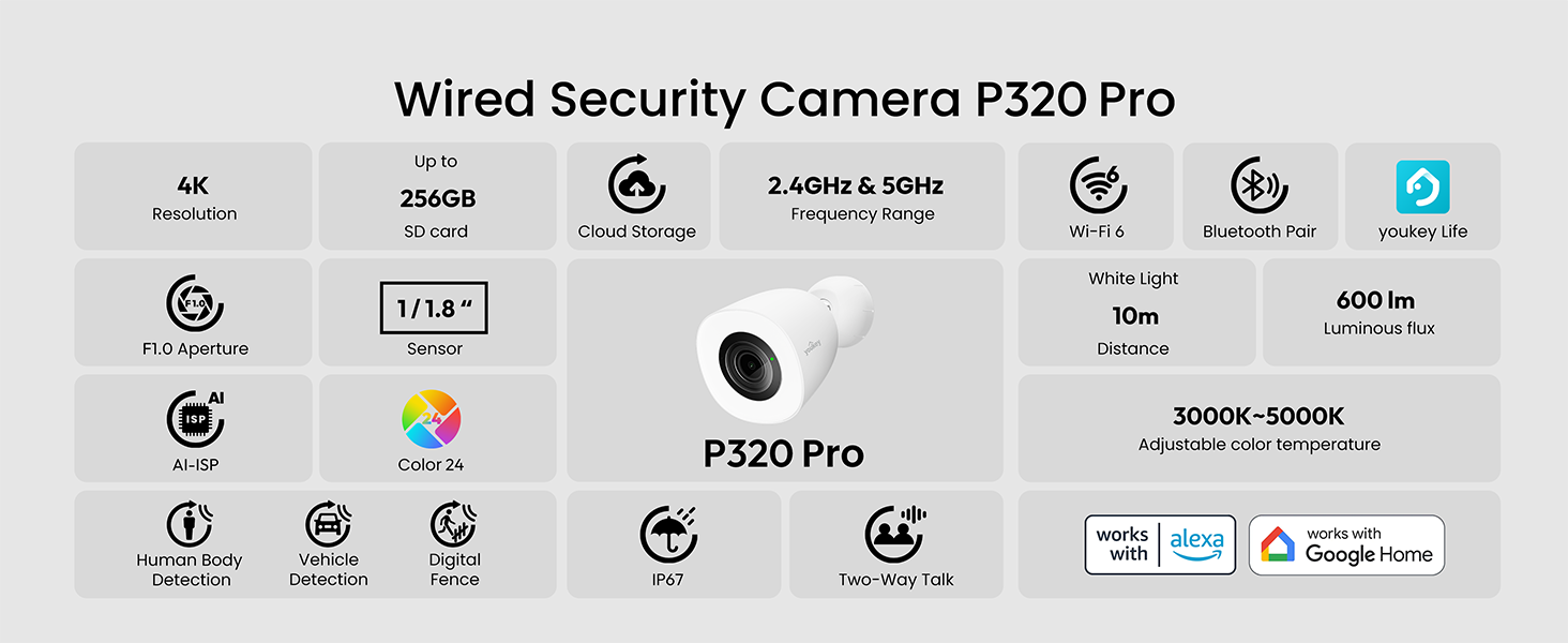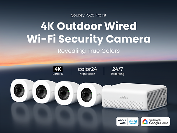 • Rugged Outdoor Design & All-Weather Protection: Featuring lightning/surge protection and an IP67 rating, the Youkey P320 Pro 4k wifi camera withstands harsh elements. It's fully waterproof, dustproof, and reliably operates in extreme temperatures (-4°F to 122°F / -20°C to 50°C). The included 16-foot power cable (9.8 ft main + 6.5 ft extension) offers flexible installation.