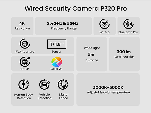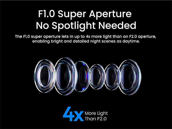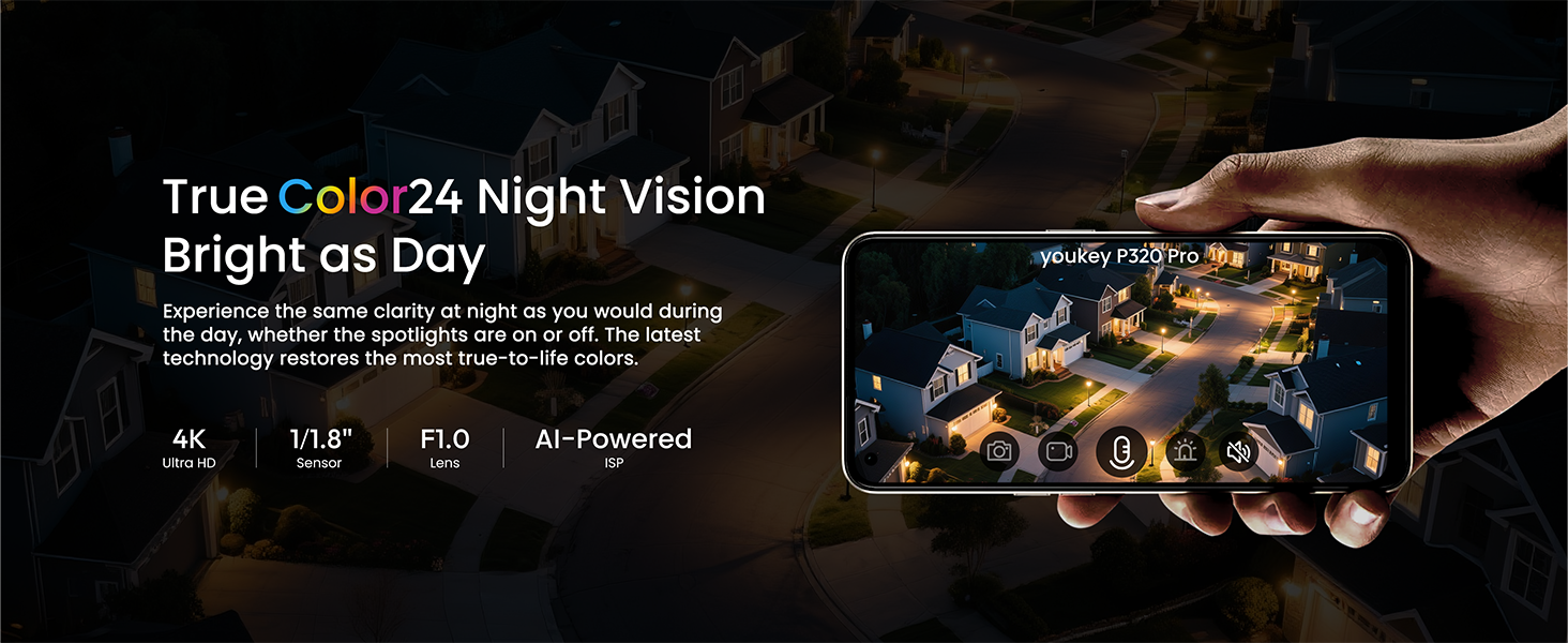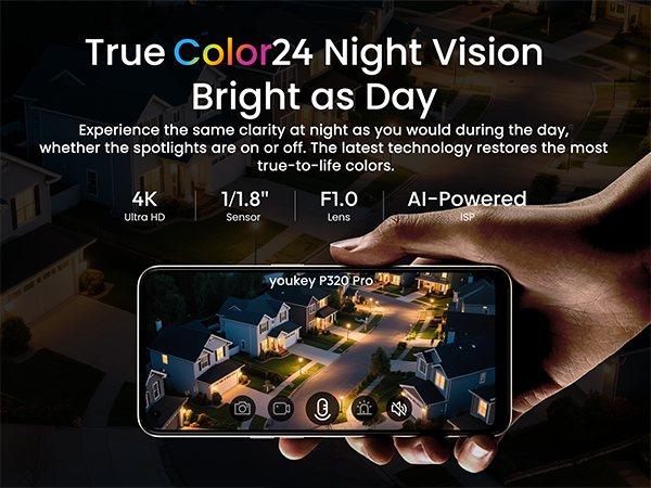 • 4K Ultra HD Night Vision: See vividly in near-total darkness! Powered by a 4K sensor, Color24 Vision technology, an ultra-wide F1.0 aperture, and a large 1/1.8" image sensor, the P320 Pro outdoor security camera captures stunning full-color detail without spotlights.