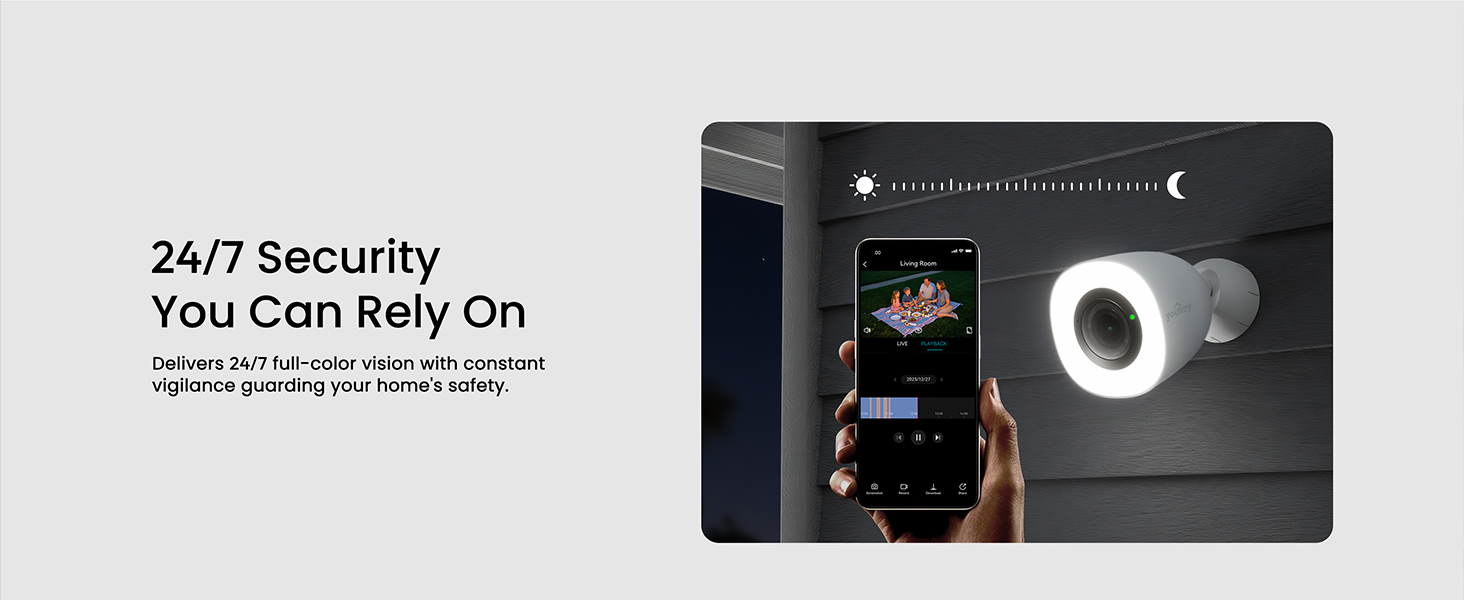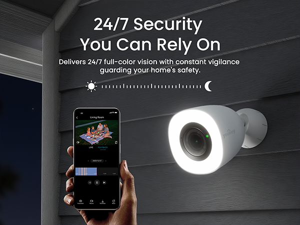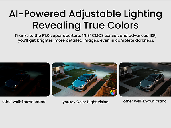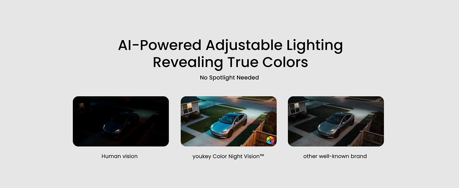 • Smart Adjustable Spotlight for Safety & Light: Control 300 lumens of light with customizable color temperature (3000K-5000K) and light brightness on your Youkey Wi-Fi outdoor camera. It ensures vivid full-color night vision and serves as handy courtyard illumination. Select Off, Auto, or Fixed mode for effortless visibility and security after dark.