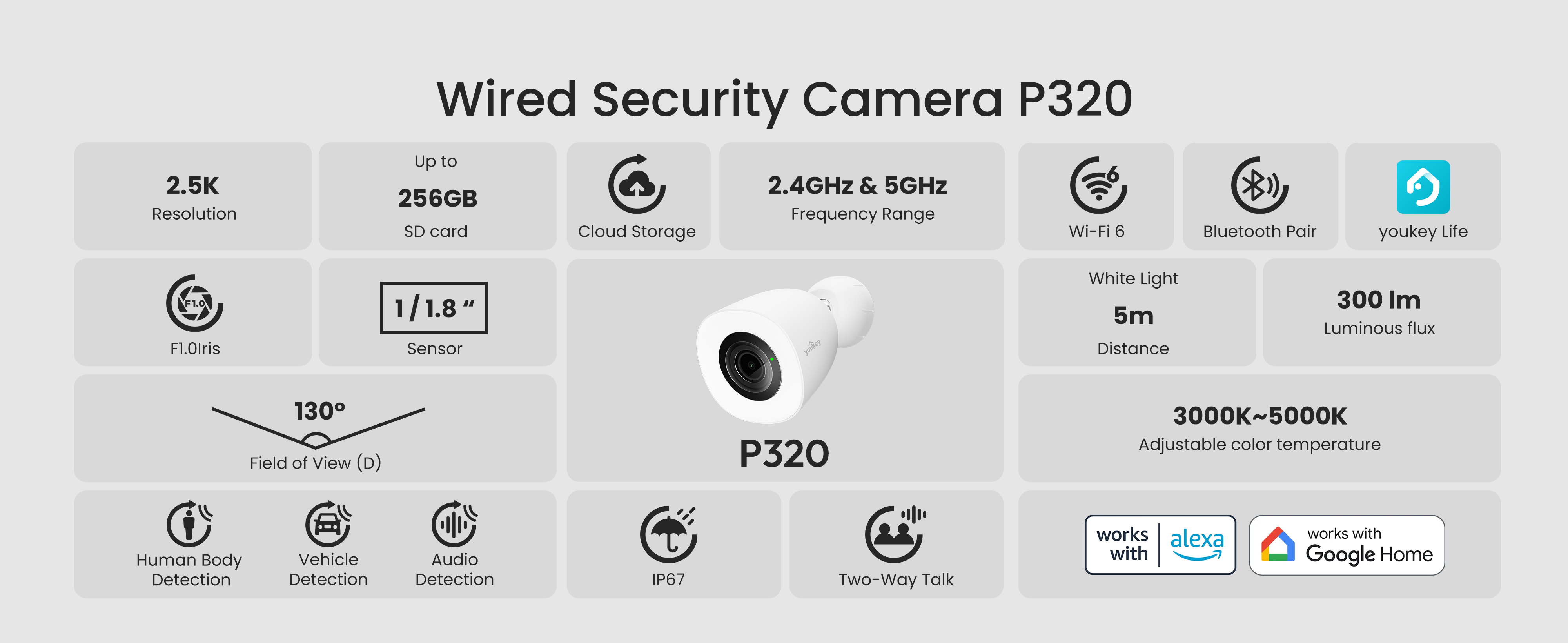 - Non-intrusive Spotlights: The bright spotlights on the Youkey Camera provides you with enhanced security and clear footage at night. With a color temperature range of 3000K ~ 5000K, it can blend with the surroundings without being disruptive.